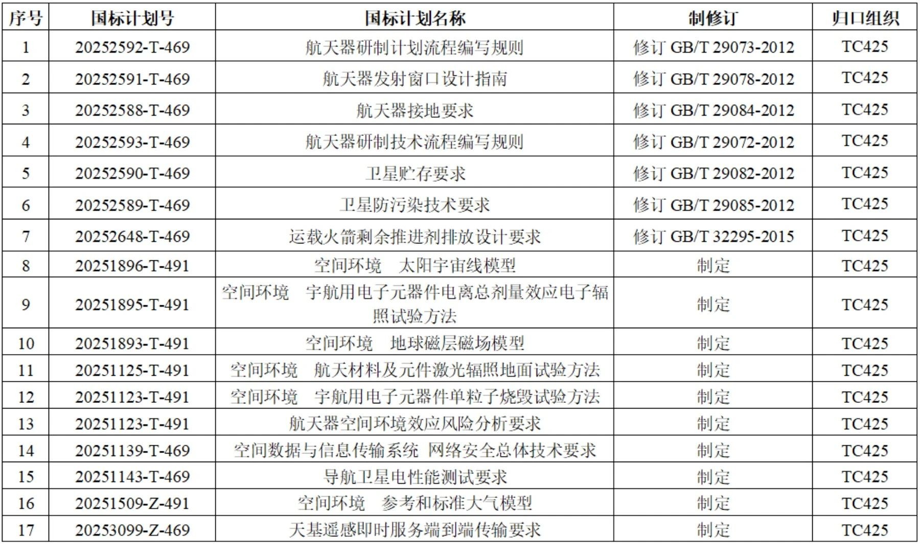 近期,国家标准化管理委员会下达了2025年第四批、第五批和第六批国家标准制修订计划,其中包括由全国宇航技术及其应用标准化技术委员会(SAC/TC425)归口的17项国标计划项目。