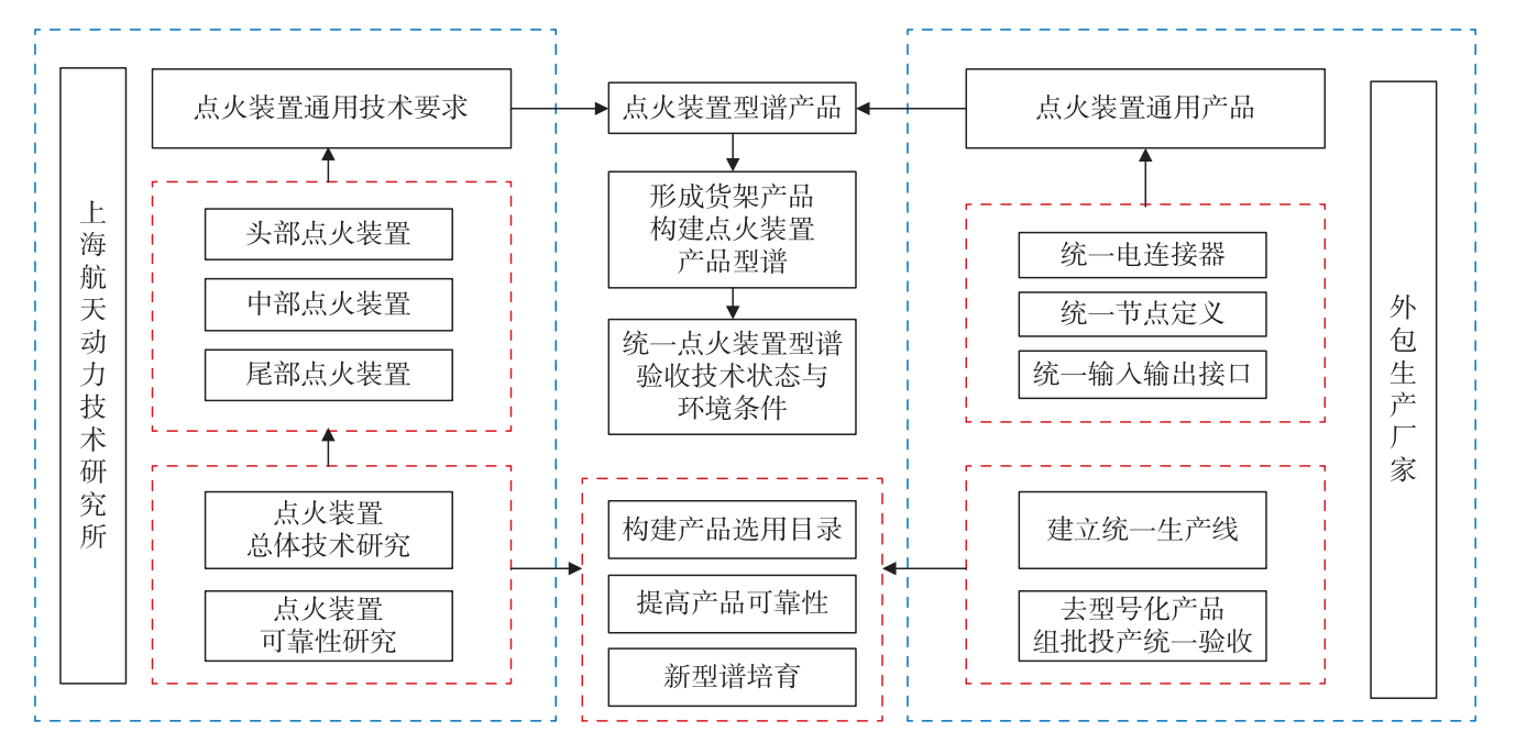 为改变这一不利局面,研究所尝试以点火装置为试点,从现状、需求和发展出发进行整体分析筹划,充分发挥固体发动机总体专业引领作用。以“点火装置型谱建设”专项工作为牵引,聚焦“产品型谱优化”、“技术标准统一”和“研制模式转型”三大工程,形成自顶向下的点火装置去型号化工作指引,具体做法如下。